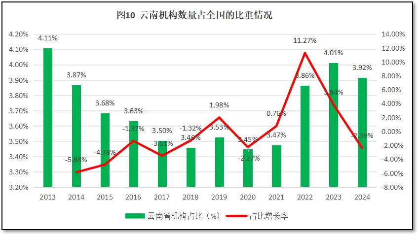 从图9可见,过去的12年,云南省检验检测机构出具报告数量的增长率曲线隔年大起大落,几乎每年都有剧烈变化。最高增幅出现在2020年,达到41.49%;但很快出现最大降幅,2021年为-21.17%;2023年出现12.13%的增长,2024年又下降到-8.13%。这些现象说明,云南省检验检测行业还比较年轻,新机构很多,发展十分不稳定,一方面在统计数据填报上随心所欲因此误差较大,另一方面云南省检验检测市场空间狭小而机构数量众多,因此竞争激烈,业务量变化大,在检验检测报告数量上大幅变动。