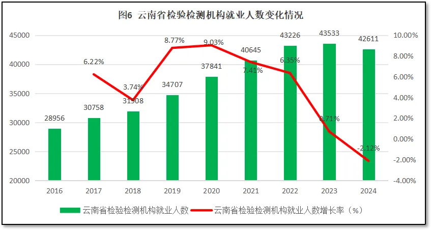 由图6可见,从2016年到2023年,云南省检验检测机构就业人口数量保持逐年增长,但在2023年达到4.35万人的峰值后2024年人数出现小幅下降,减少约1100人左右。从增长率曲线看,云南省检验检测机构就业人数从2016年的2.9万人增长到2024年的4.26万人,增长约1.47倍,年均增速5.01%。2019-2022年期间,云南省检验检测机构就业人数增长率保持在较高速度上,但2022年以后逐年下降,2024年降为负值,增长率为-2.12%。