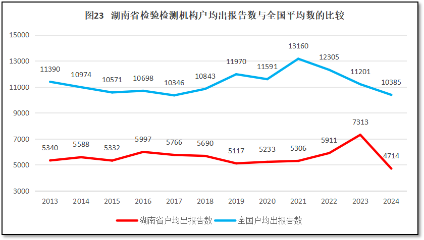 2024年度,湖南省检验检测机构户均出具检验检测报告4714份,是全国平均水平10385份的45.4%,全国排名第27位,处于十分靠后的水平。从2013年以来,湖南省检验检测机构户均出具检验检测报告数量与全国的比较,如图23所示。