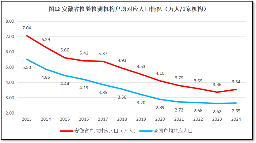 再来看安徽地区检验检测机构户均对应服务的人口情况。2024年末,安徽省常住人口6123万人,检验检测机构户均服务人口3.54万人,比全国平均数2.65万人高出8900人,排名全国第3位,较2023年度排名提升1位。可见,相对于安徽省人口数量来说,当地的检验检测机构数量显得并不多。过去12年,安徽省检验检测机构户均对应的人口数量与全国的情况进行比较,如图12所示。