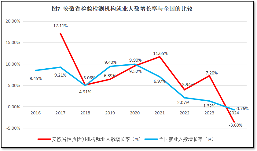 安徽省检验检测机构就业人数增长率与全国检验检测机构就业人数增长率的比较如图7所示。